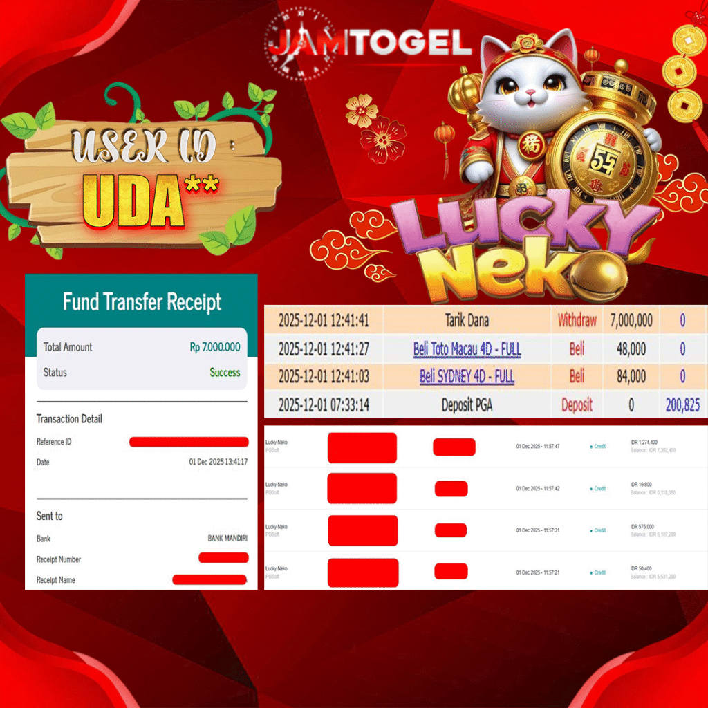 Selamat kepada member setia JAMTOGEL ID UDA** Telah menang dalam permainan SLOT LUCKY NEKO RP 7,000,000, – LUNAS langsung mendarat ke rekening tanpa bertele – tele atau syarat apapun. Kami ucapkan terimakasih telah mempercayakan JAMTOGEL sebagai situs bandar terpercaya yang dijamin aman dikarenakan berapapun kemenangan member pasti LUNAS!