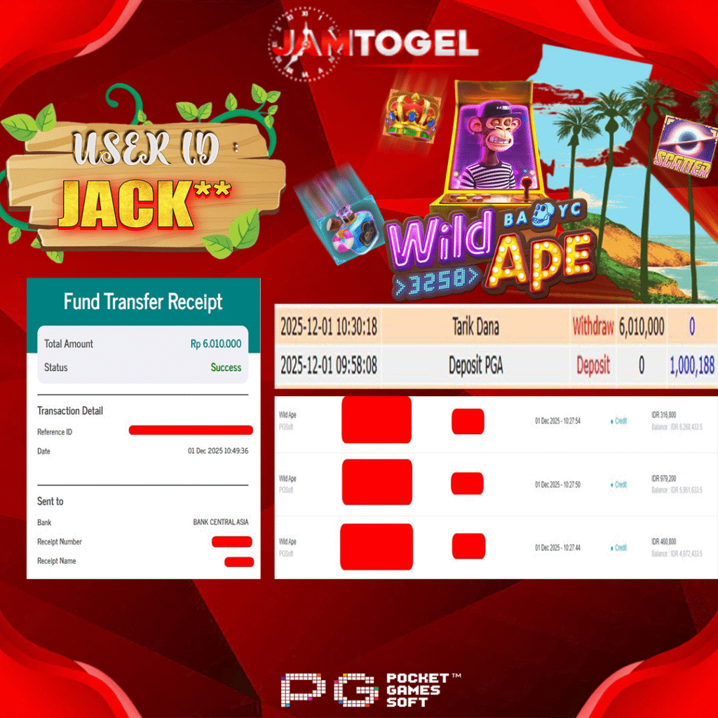 Selamat kepada member setia JAMTOGEL ID JACK** Telah menang dalam permainan SLOT WILD APE RP 6,010,000, – LUNAS langsung mendarat ke rekening tanpa bertele – tele atau syarat apapun. Kami ucapkan terimakasih telah mempercayakan JAMTOGEL sebagai situs bandar terpercaya yang dijamin aman dikarenakan berapapun kemenangan member pasti LUNAS!