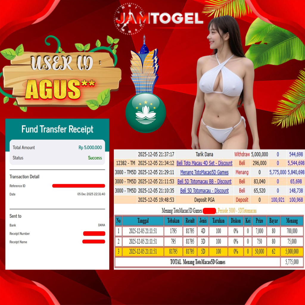Selamat kepada member setia JAMTOGEL ID AGUS** Telah menang dalam permainan TOTO MACAU RP 5,000,000, – LUNAS langsung mendarat ke rekening tanpa bertele – tele atau syarat apapun. Kami ucapkan terimakasih telah mempercayakan JAMTOGEL sebagai situs bandar Togel online terpecaya dijamin aman dikarenakan berapapun kemenangan member pasti LUNAS!
