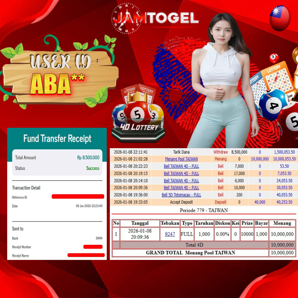 Selamat kepada member setia JAMTOGEL ID ABA** Telah menang dalam permainan TAIWAN POOLS RP 8,500,000, – LUNAS langsung mendarat ke rekening tanpa bertele – tele atau syarat apapun. Kami ucapkan terimakasih telah mempercayakan JAMTOGEL sebagai situs bandar terpercaya yang dijamin aman dikarenakan berapapun kemenangan member pasti LUNAS!