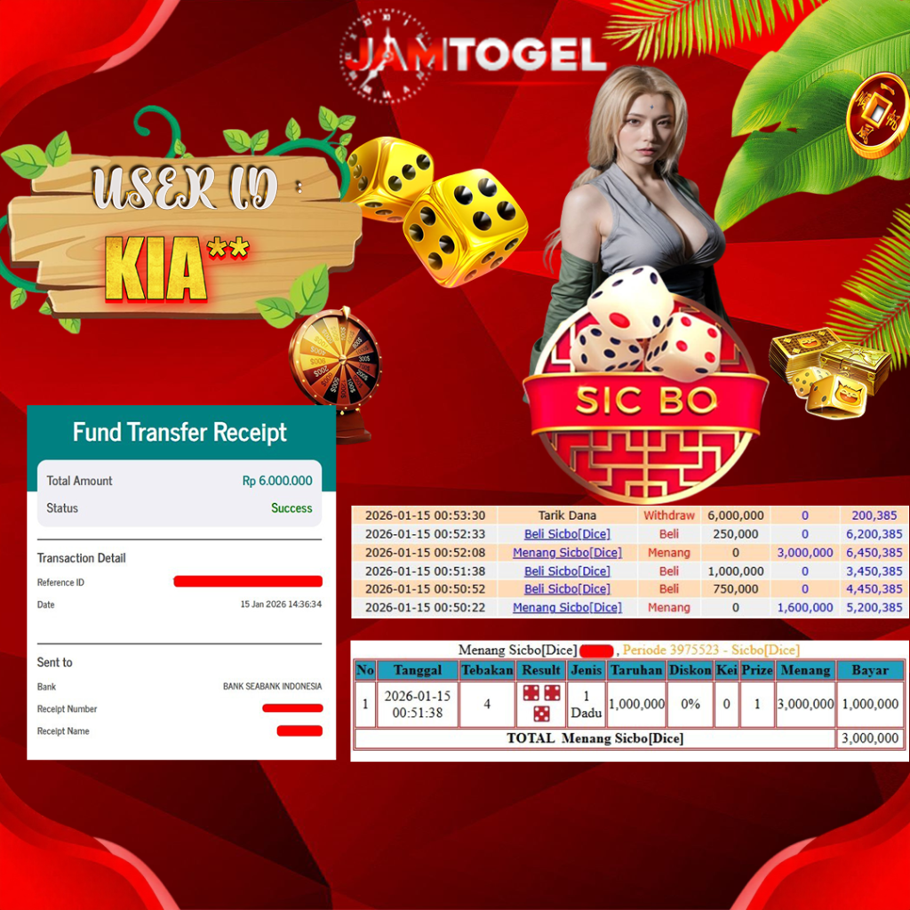 Selamat kepada member setia JAMTOGEL ID KIa** Telah menang dalam permainan LIVE GAMES SICBO [DICE] RP 6,000,000, – LUNAS langsung mendarat ke rekening tanpa bertele – tele atau syarat apapun. Kami ucapkan terimakasih telah mempercayakan JAMTOGEL sebagai situs bandar terpercaya yang dijamin aman dikarenakan berapapun kemenangan member pasti LUNAS!