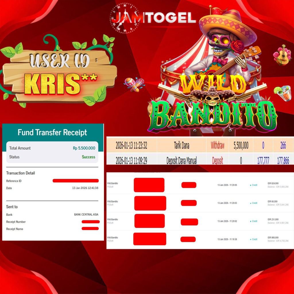 Selamat kepada member setia JAMTOGEL ID KRIS** Telah menang dalam permainan SLOT WILD BANDITO RP 5,500,000, – LUNAS langsung mendarat ke rekening tanpa bertele – tele atau syarat apapun. Kami ucapkan terimakasih telah mempercayakan JAMTOGEL sebagai situs bandar terpercaya yang dijamin aman dikarenakan berapapun kemenangan member pasti LUNAS!