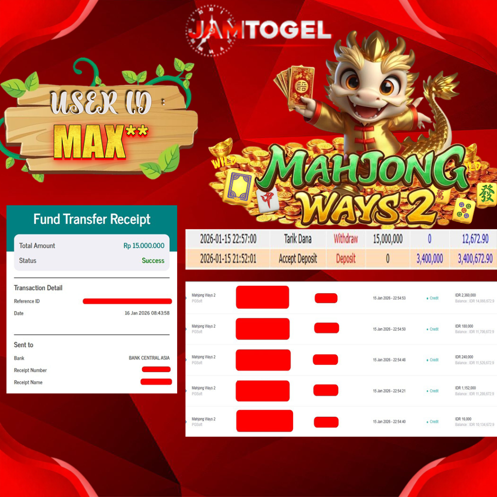 Selamat kepada member setia JAMTOGEL ID MAX** Telah menang dalam permainan SLOT MAHJONG WAYS 2 RP 15.000,000, – LUNAS langsung mendarat ke rekening tanpa bertele – tele atau syarat apapun. Kami ucapkan terimakasih telah mempercayakan JAMTOGEL sebagai situs bandar terpercaya yang dijamin aman dikarenakan berapapun kemenangan member pasti LUNAS!