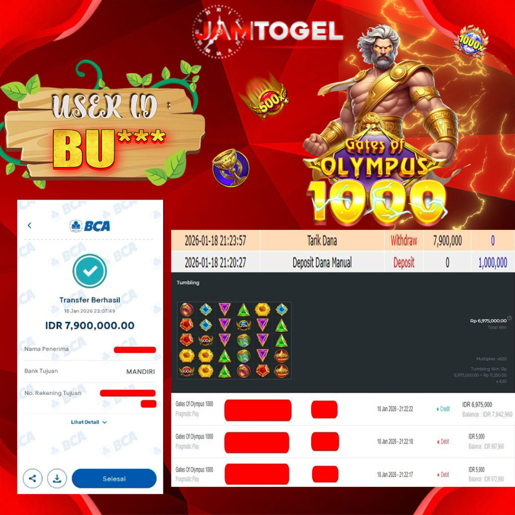 Selamat kepada member setia JAMTOGEL ID BU** Telah menang dalam permainan SLOT GATE OF OLYMPUS 1000 RP 7,900,000 – LUNAS langsung mendarat ke rekening tanpa bertele – tele atau syarat apapun. Kami ucapkan terimakasih telah mempercayakan JAMTOGEL sebagai situs bandar terpercaya yang dijamin aman dikarenakan berapapun kemenangan member pasti LUNAS!