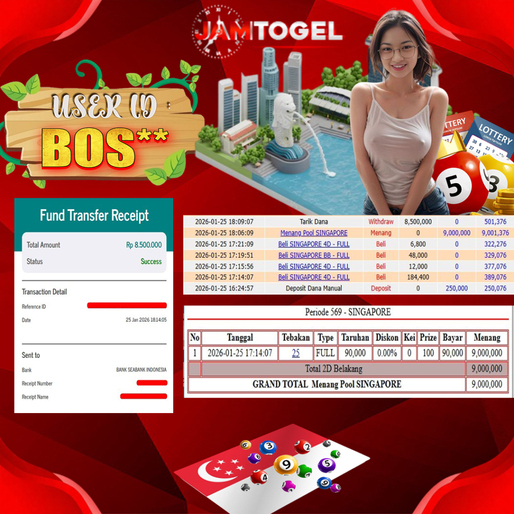 Selamat kepada member setia JAMTOGEL ID BOS** Telah menang dalam permainan SINGAPORE POOLS RP 8,500,000, – LUNAS langsung mendarat ke rekening tanpa bertele – tele atau syarat apapun. Kami ucapkan terimakasih telah mempercayakan JAMTOGEL sebagai situs bandar terpercaya yang dijamin aman dikarenakan berapapun kemenangan member pasti LUNAS!