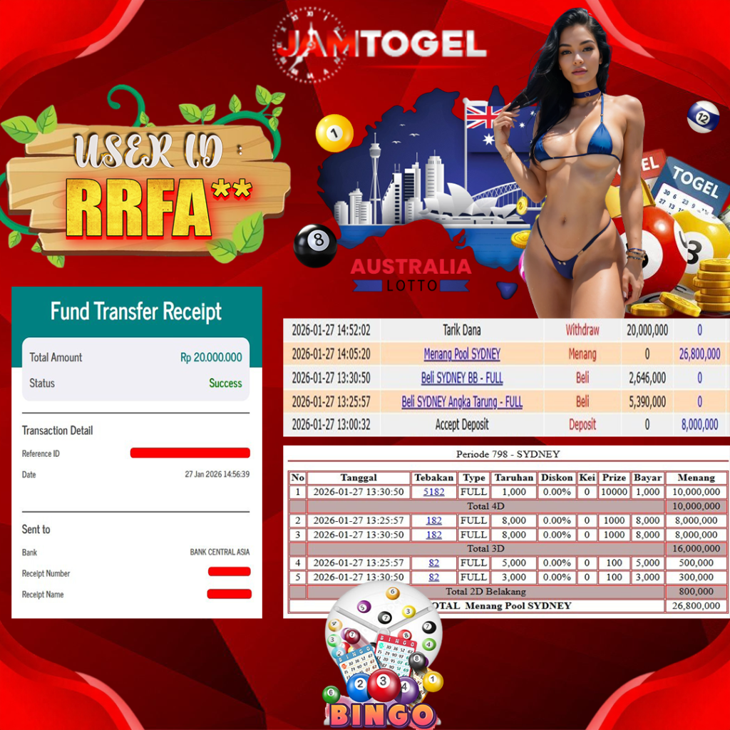 Selamat kepada member setia JAMTOGEL ID RRFA** Telah menang dalam permainan SYDNEY RP 20,000,000, – LUNAS langsung mendarat ke rekening tanpa bertele – tele atau syarat apapun. Kami ucapkan terimakasih telah mempercayakan JAMTOGEL sebagai situs bandar terpercaya yang dijamin aman dikarenakan berapapun kemenangan member pasti LUNAS!