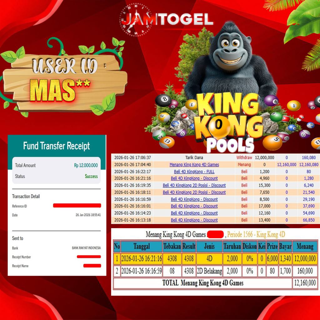 Selamat kepada member setia JAMTOGEL ID MAS** Telah menang dalam permainan KING KONG 4D POOLS RP 12,000,000, – LUNAS langsung mendarat ke rekening tanpa bertele – tele atau syarat apapun. Kami ucapkan terimakasih telah mempercayakan JAMTOGEL sebagai situs bandar terpercaya yang dijamin aman dikarenakan berapapun kemenangan member pasti LUNAS!