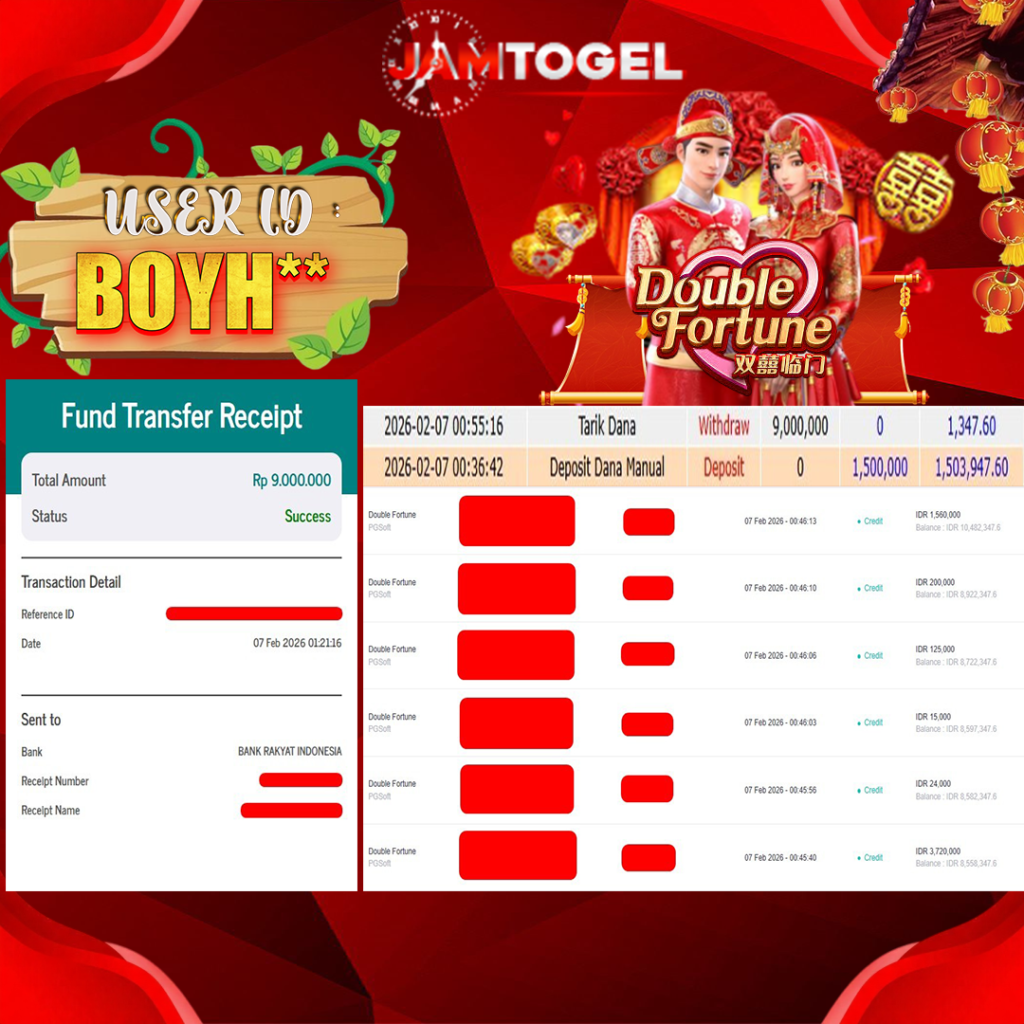 Selamat kepada member setia JAMTOGEL ID BOYH** Telah menang dalam permainan SLOT DOUBLE FORTUNE RP 9.0000,000, – LUNAS langsung mendarat ke rekening tanpa bertele – tele atau syarat apapun. Kami ucapkan terimakasih telah mempercayakan JAMTOGEL sebagai situs bandar terpercaya yang dijamin aman dikarenakan berapapun kemenangan member pasti LUNAS!