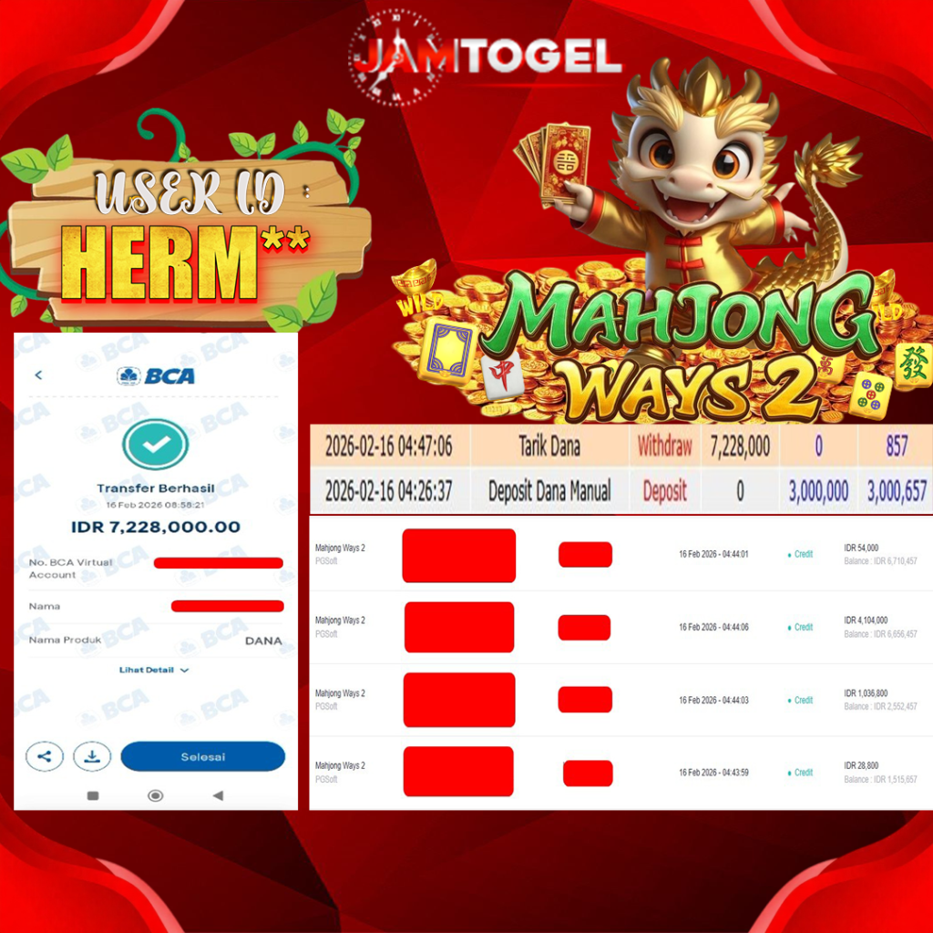 Selamat kepada member setia JAMTOGEL ID HERM** Telah menang dalam permainan SLOT MAHJONG WAYS 2 RP 7.228,000, – LUNAS langsung mendarat ke rekening tanpa bertele – tele atau syarat apapun. Kami ucapkan terimakasih telah mempercayakan JAMTOGEL sebagai situs bandar terpercaya yang dijamin aman dikarenakan berapapun kemenangan member pasti LUNAS!