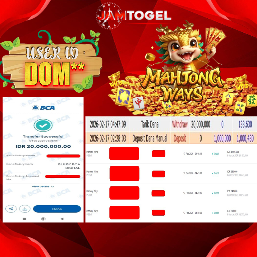 Selamat kepada member setia JAMTOGEL ID DOM** Telah menang dalam permainan SLOT MAHJONG WAYS RP 20.000,000, – LUNAS langsung mendarat ke rekening tanpa bertele – tele atau syarat apapun. Kami ucapkan terimakasih telah mempercayakan JAMTOGEL sebagai situs bandar terpercaya yang dijamin aman dikarenakan berapapun kemenangan member pasti LUNAS!